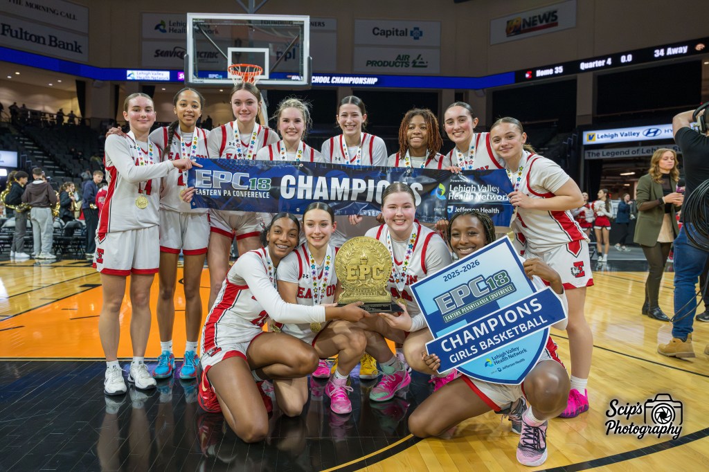 - Bethlehem Catholic and Easton split their regular season meetings and there was plenty of anticipation for a third and final matchup of the season on the big stage at the PPL Center. Early on, it was all Hawks. Kendall Nickischer’s first quarter left-wing three ball made it 8-0. Easton didn’t get on the board until freshman Eva Jordan tripled to make the score 10-3. Put a pin in Jordan’s name for later. Elena Brunetti scored near the end of the first and after one, it was 10-8 Beca. Nat Amato gave Easton its first lead in the second quarter when she hit a three from the left side. By halftime, the Red Rovers had a thin 20-18 edge. Easton pushed its lead to seven early in the third, but Nickischer and Kam Gallis would not be deterred. Bethlehem Catholic went on a 7-0 run and took the lead back at 28-26 and led 30-28 after three frames. Scoring came at a severe premium in the final eight minutes. Gallis moved ahead 30-26. As time ticked down, though, the score was knotted at 30 a piece with 2:30 to play. Melina Cole threw a deep pass from three steps beyond the 3-point line to Eva Jordan down low and Jordan laid it in to put Easton ahead 32-30. Melina Cole’s free throws then made it 34-30 with :26 to play. Aliyah Brame’s layup would give the Hawks the game tying shot with six seconds left, but a miscommunication resulted in Becahi fouling and sending Eva Jordan to the free throw line with three ticks remaining. She missed the first, but the second rolled true. Brame’s last second shot from near half court bounced off the rim and Easton hung on for the razor-thin 35-34 victory. While Melina Cole led all scorers with 12, it was, once again, a full team effort by the Red Rovers that secured them their first EPC title in ten seasons.